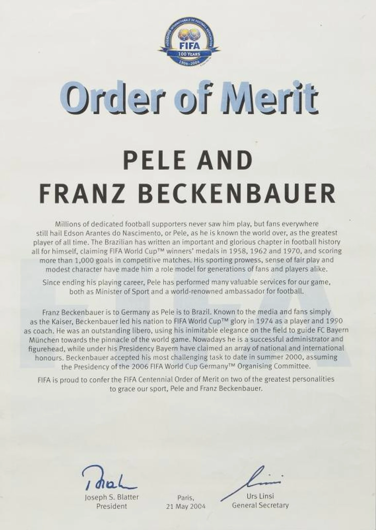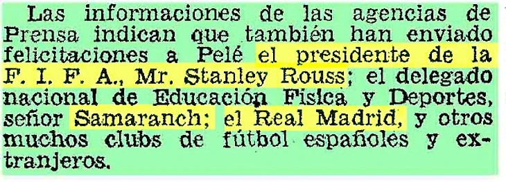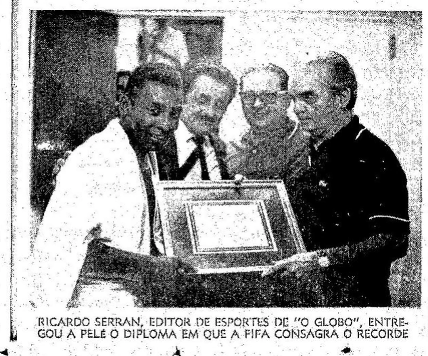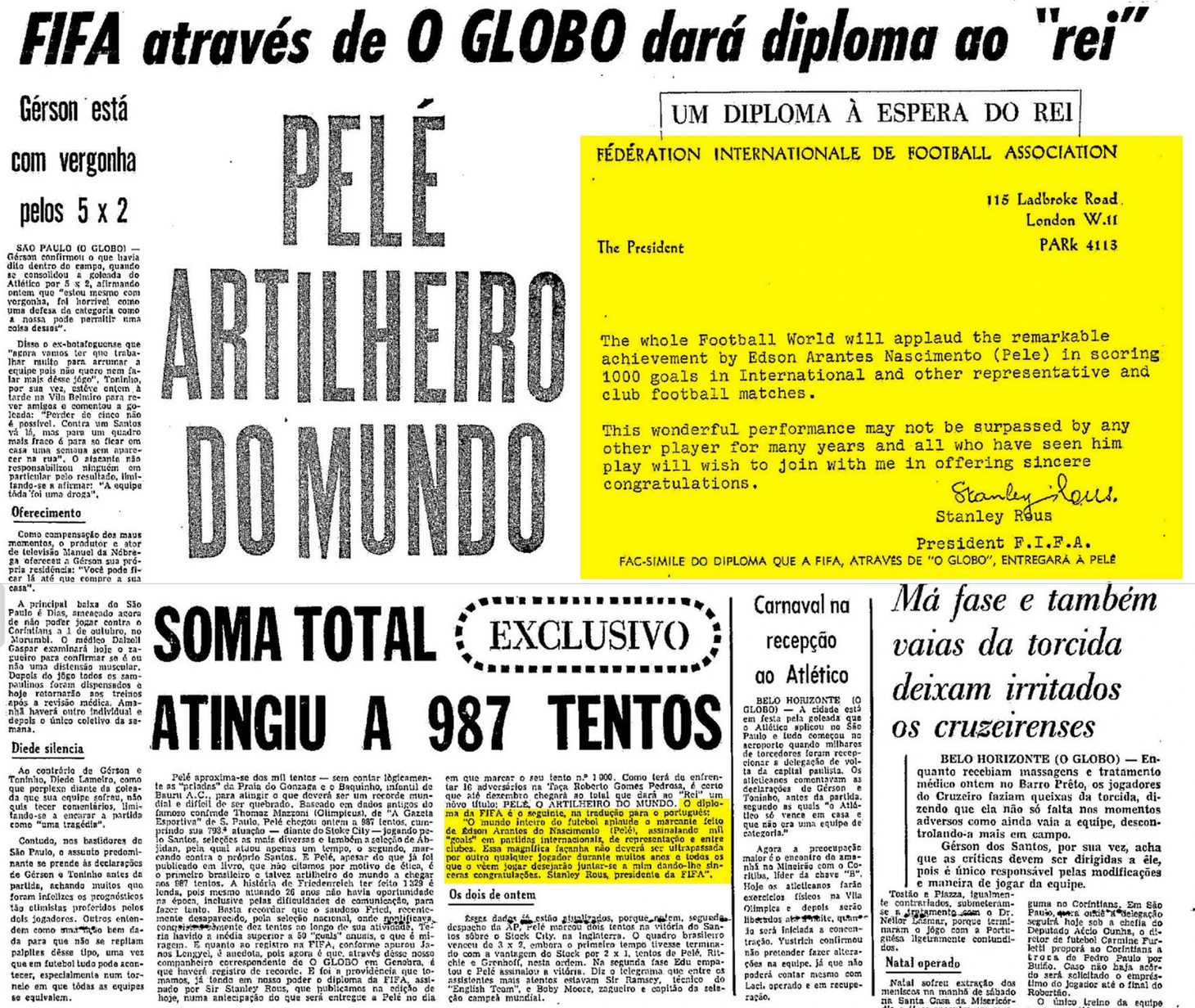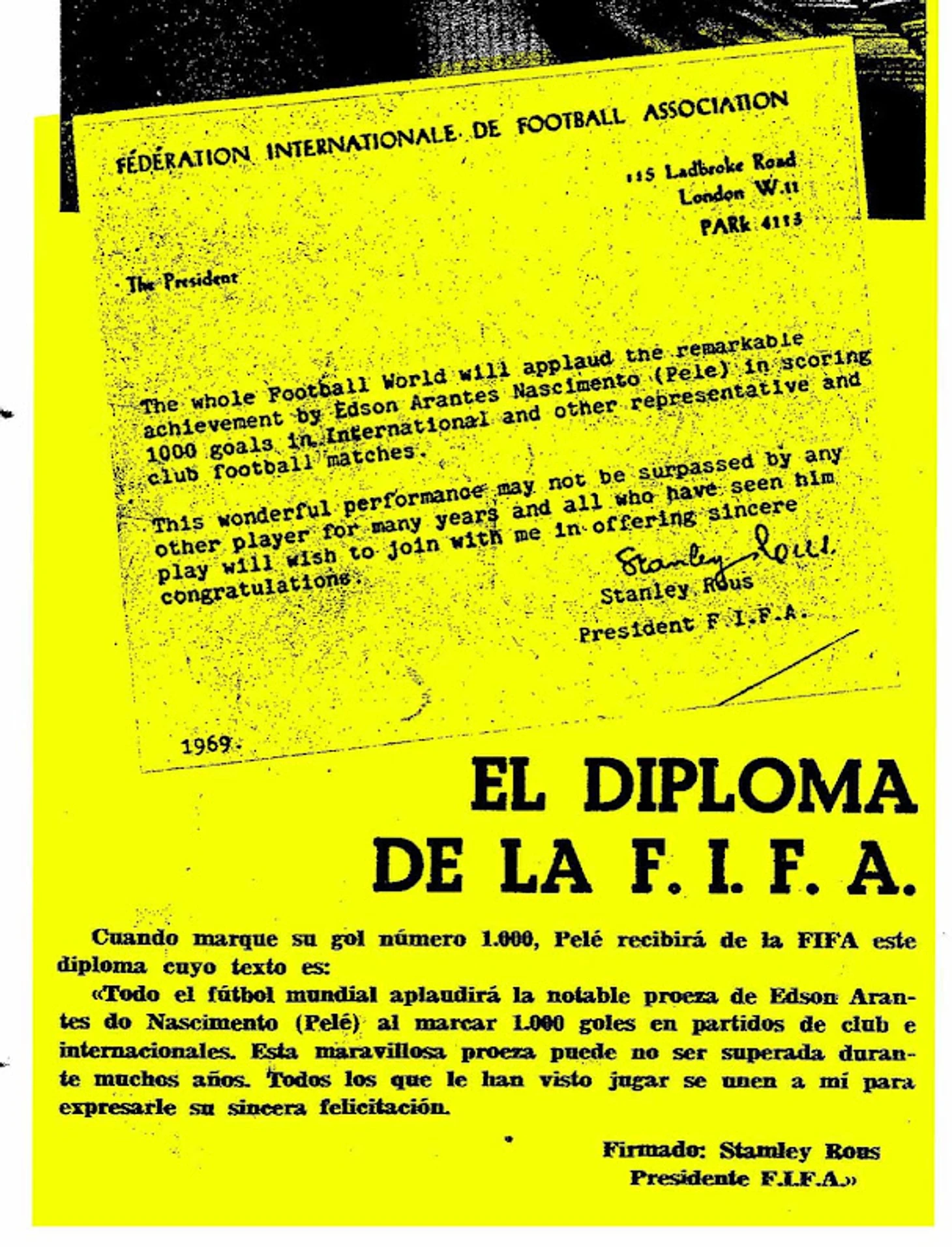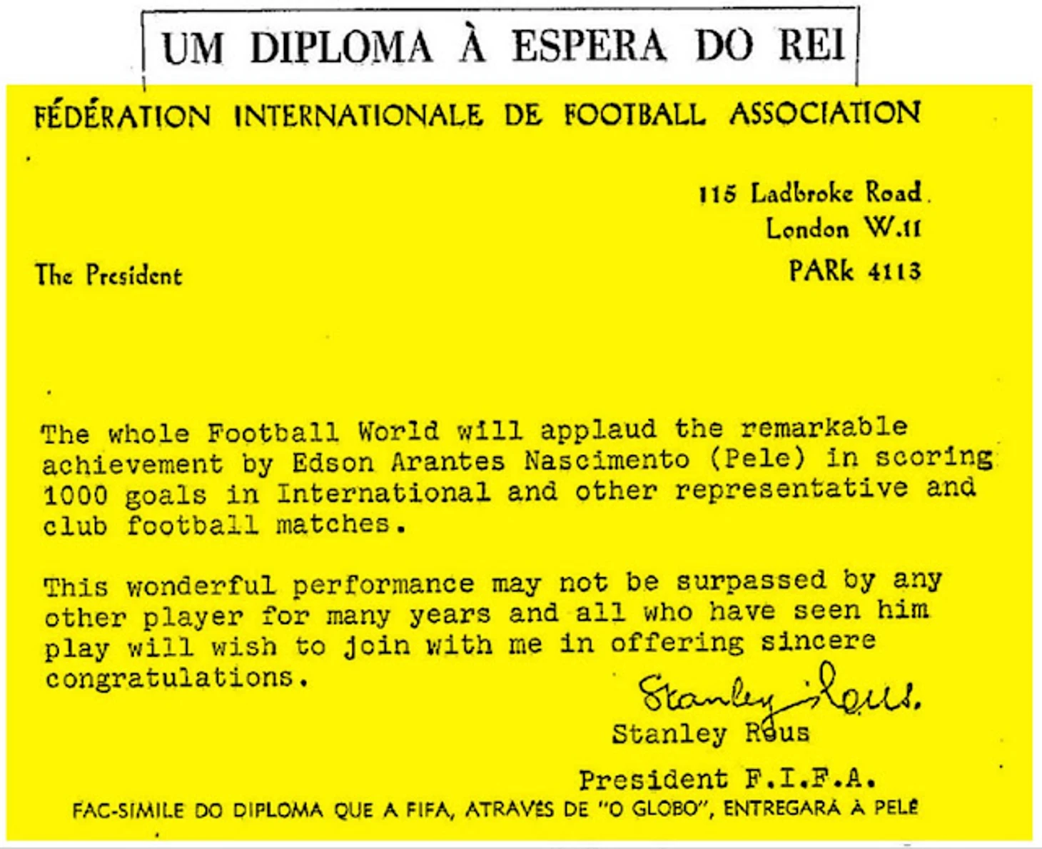 "Весь мир будет аплодировать замечательному подвигу Эдсона Арантеса ду Насименто (Пеле), забившего 1000 голов в клубных и международных матчах . Этот чудесный подвиг, возможно, не удастся превзойти еще многие годы. Мои искренние поздравления. Подпись Стэнли Роуз, президент ФИФА.