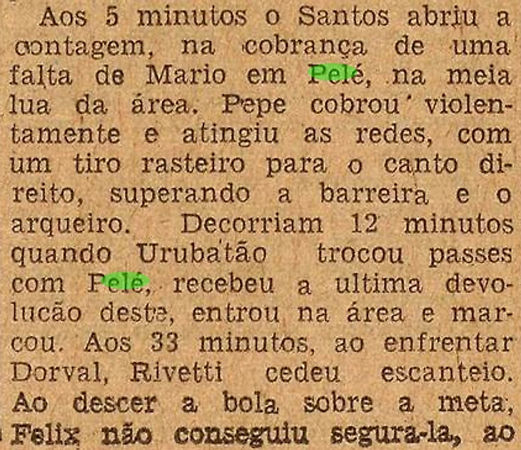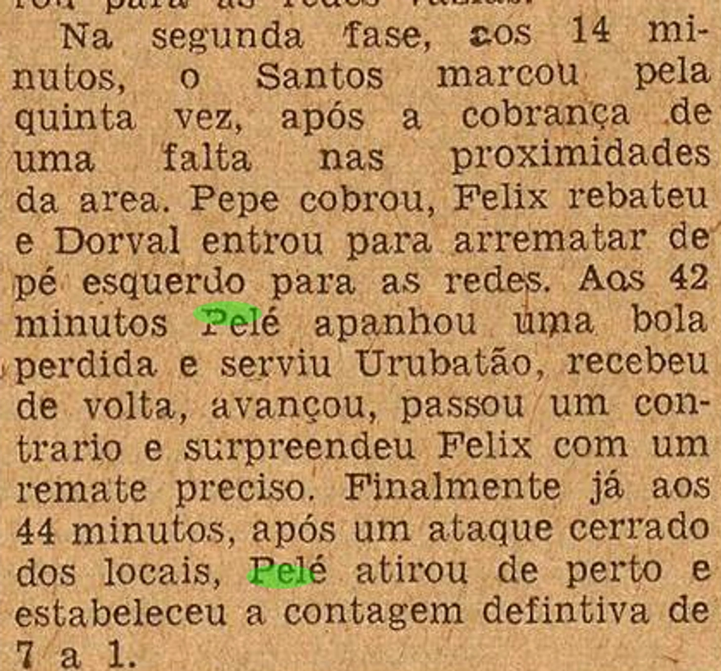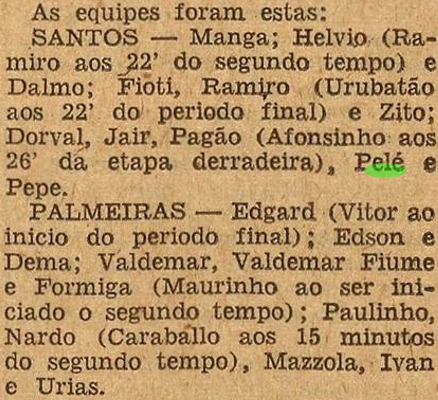 Пример упоминания гола Пеле прямым ударом со штрафного. Против Палмейраса 29.11.1961