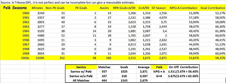 Кстати еще один забавный факт. Обратили внимание на результативность "Барсы"/"Сантоса" без своей главной звезды и с ней на поле? С Пеле "Сантос" забивал 2,78 гола за матч, без него 2,037. То есть почти минус гол.