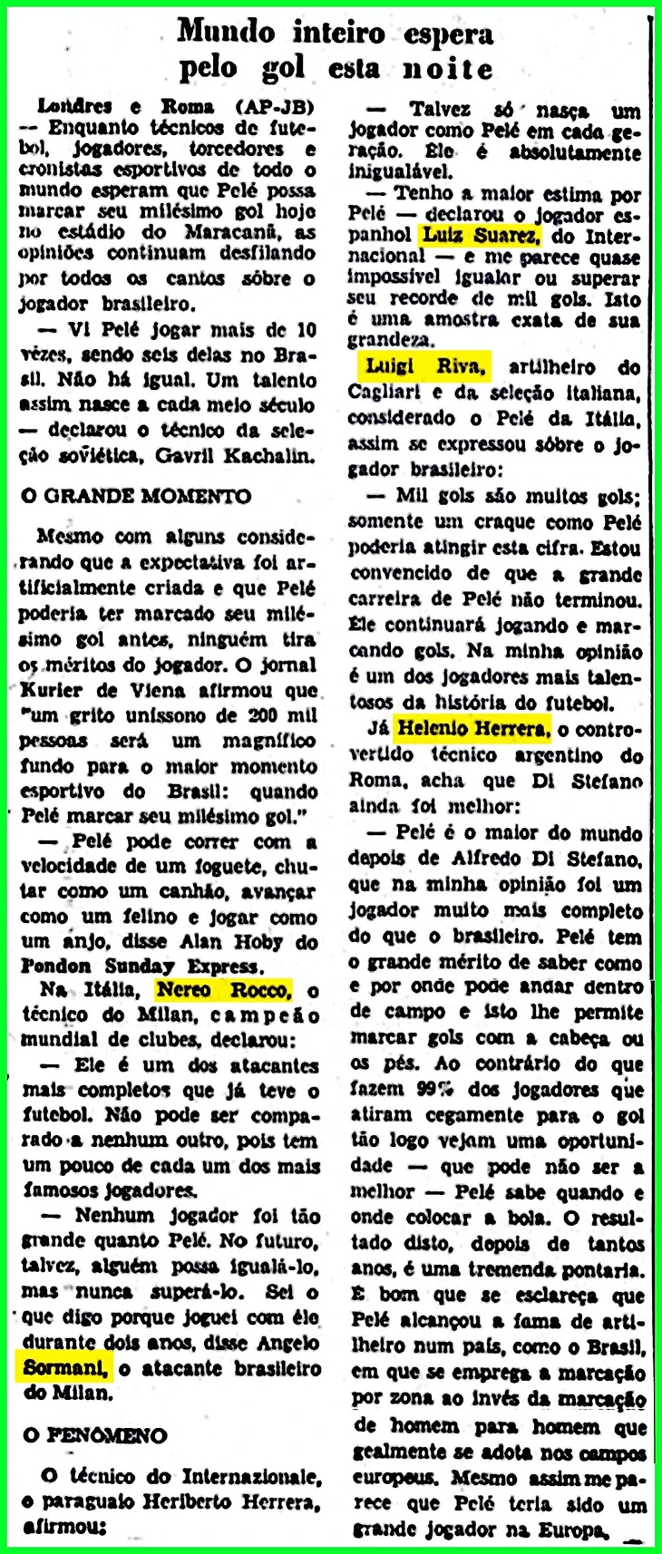 Джиджи Рива. «Тысяча голов - это много; только такая звезда, как Пеле, могла достичь этой цифры. Я убежден, что карьера Пеле не окончена. Он будет продолжать играть и забивать голы. На мой взгляд, он один из самых талантливых. игроков в истории».