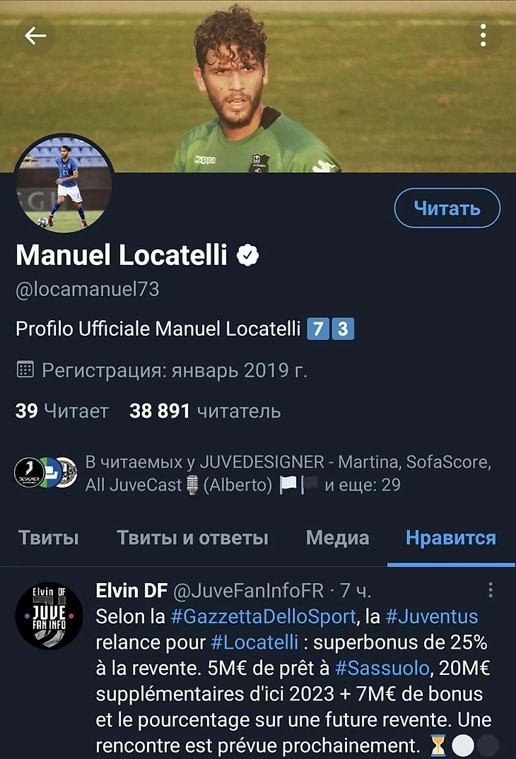 Полузащитник «Сассуоло» Мануэль Локателли «лайкнул» твит пользователя ElvinDF, который сообщил, что «Ювентус» запланировал новую встречу с «нероверди» по трансферу игрока.