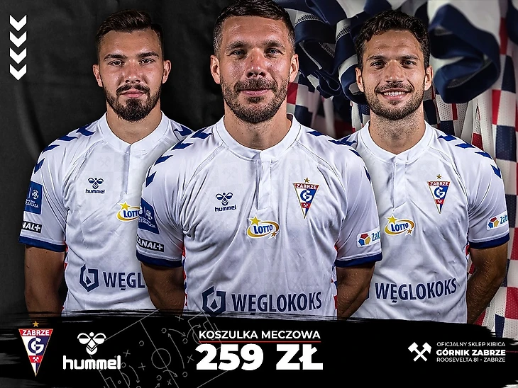 Одной из главных звезд при презентации новой формы стал, конечно же, Лукас Подольски. Домашний комплект выполнен в белых цветах, сохранилась и шахматка красно-сине-белых цветов, которая теперь расположена на боковой части футболки. Просматривается шахматка и на передней части футболке, также имеются там скрещенные молотки - привычный элемент шахтёрских клубов. На задней части воротника расположена аббревиатура KSG (Klub Sportowy Górnik).