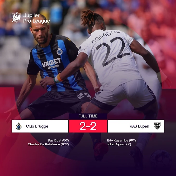 В первом тайме команды обменивались опасными ударами, но счет так и не открыли – выручали вратари. Вскоре после перерыва Агбаду сыграл рукой, а Дост реализовал пенальти. «Эйпен» навалился и отыгрался уже через пять минут, а затем и вовсе вышел вперед. Из-за большого количества пауз судья добавил к основному времени целых десять минут, но в итоге команды играли еще дольше. В последней атаке на 103-й минуте де Кетеларе спас «Брюгге» от поражения.