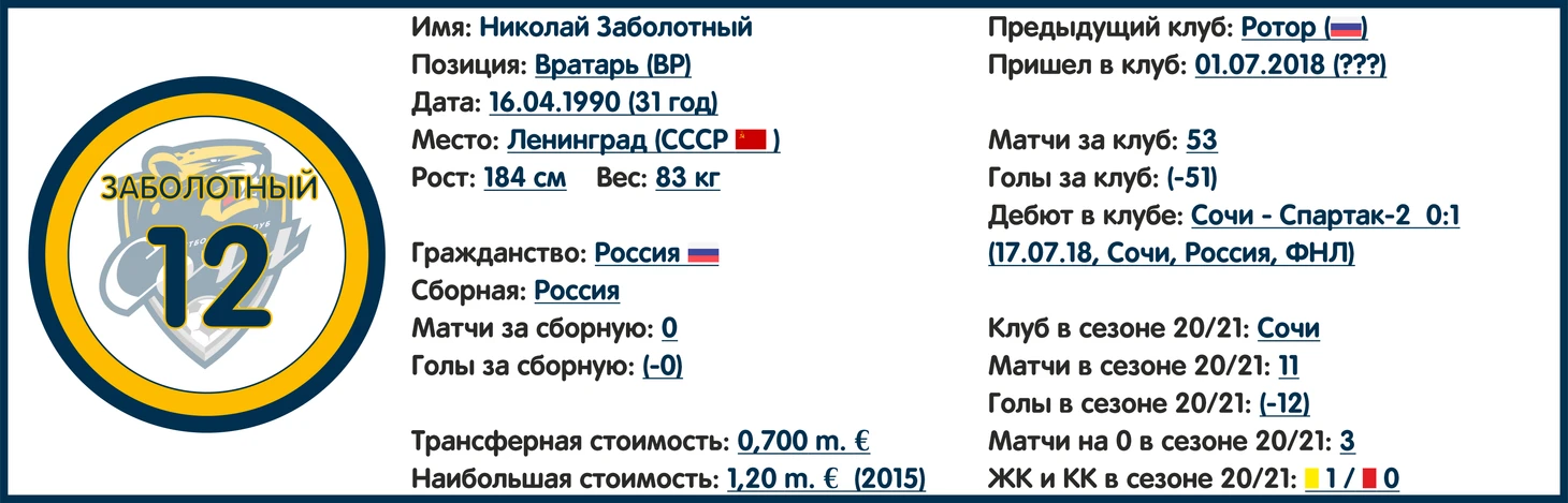 Весь прошлый сезон основным вратарём команды был опытнейший Сослан Джанаев, однако концовку того чемпионата он пропустил из-за травмы, полученной им на разминке перед игрой со «Спартаком» (из-за нее же он не смог принять участия и в Евро 2020, где у него были шансы не просто быть в итоговой заявке, но и сыграть на турнире).