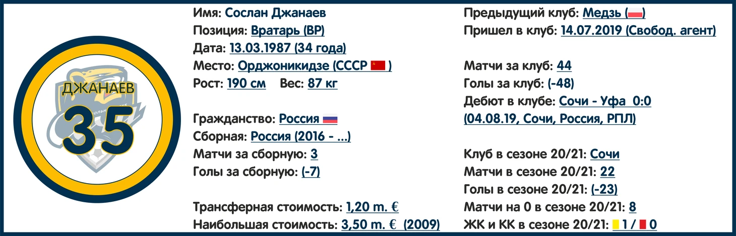 Сослан Джанаев вполне мог бы поехать вторым вратарём сборной России на недавний Евро-2020 (являлся одним из любимчиков бывшего главного тренера сборной Станислава Черчесова), однако буквально за месяц до его старта получил травму на тренировке и восстановиться не успел.