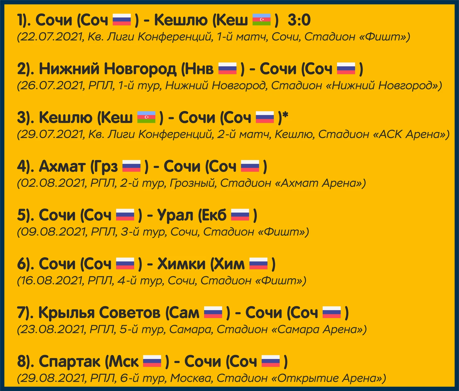 * (при удачной игре команды в поединке квалификации Лиги Конференций против азербайджанского «Кешлю», клуб будет участвовать и в следующем раунде отбора, где соперником сочинцев может стать либо сербский «Партизан», либо словацкий клуб «ДАК 1904» (встречи тогда пройдут 5 и 12 августа)).