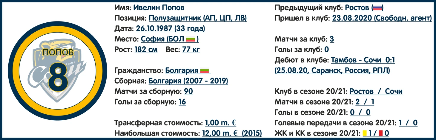 Так же все давно ждут возвращение на футбольное поле 33-летнего болгарина Ивелина Попова, практически не игравшего в прошлом сезоне из-за тяжелейшего разрыва связок колена (и он уже надо сказать, появлялся на замену в обоих матчах этого сезона).
