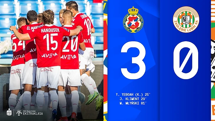 Краковчане быстро сообразили ответную атаку, которая закончилась фолом в исполнении любинцев. Удар Йебоа вышел плотным и Хладуну пришлось переводить мяч на угловой. А на 22-ой минуте уже «белая звезда» получила шанс на пенальти. Россиянин Башкиров рукой остановил прострел Стажиньского (17-летнего Пётра из «Вислы»). После просмотра повтора арбитр показал на точку - Йебоа подошёл к мячу и уверенно привёл приговор в исполнение. Прошло пять минут, и Йебоа отдаёт предголевую передачу на Скварку, под удар которого подставляет ногу Климент. Гол и ассист в этом случае записали на свой счёт новички краковчан.