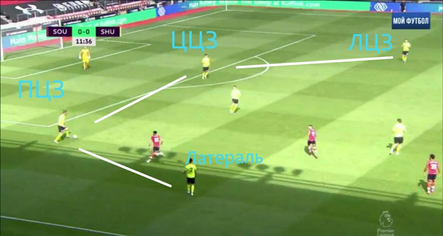 Удивительно, но на своей половине поля, тройка защитников могли располагаться по-разному. Приведу примеры.(заранее извиняюсь за качество)