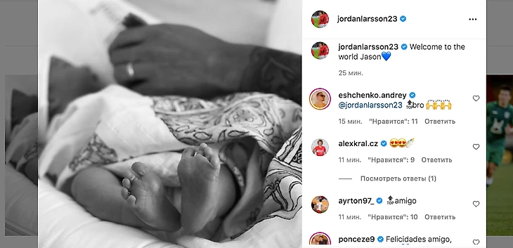 В семье нападающего «Спартака» Джордана Ларссона произошло радостное событие: невеста форварда Бьянка родила мальчика!