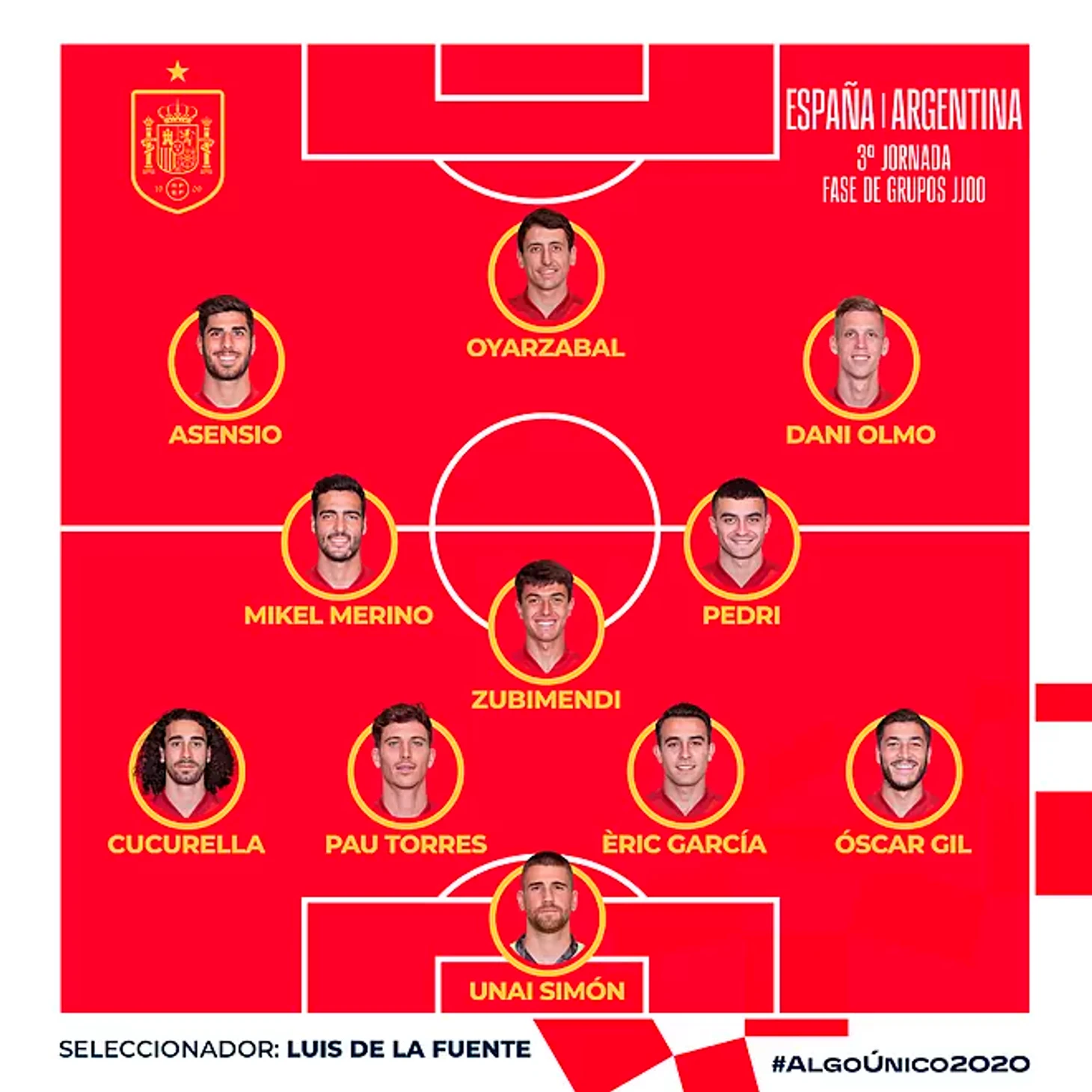 Сегодня в Японии завершился групповой турнир. Сборная Испании повторила рекорд сборной Англии на Евро, с двумя голами заняв первое место. Причем, у Англии разница мячей даже лучше: 2:0 против испанских 2:1. В заключительном матче против сборной Аргентины испанцев устраивала ничья, которая, правда, могла отправить их на второе место и на бразильцев в 1/4. В итоге матч завершился со счетом 1:1, за испанцев забил Мерино, вышедший с капитанской повязкой, несмотря на то что вместе с ним играл Ойарсабаль, капитан "Сосьедада", за который выступает и Мерино. Кстати, у сборной Испании в трех матчах три разных капитана. Это напоминает сборную Бразилии на чемпионате мира-2018. Но у испанцев, в отличие от Бразилии, первая смена капитана была вынужденной: Дани Себальос получил жуткую травму.