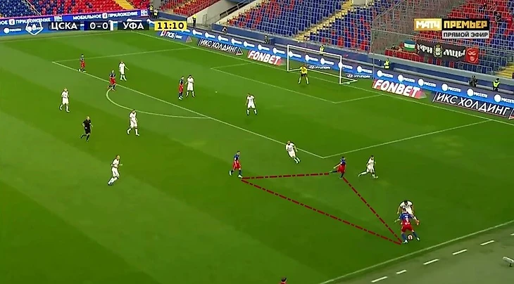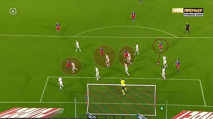 ЦСКА использовал схему 4-3-3 и при владении много атаковал через фланги. Они строили треугольники и старались вывести одного из партнёров на свободное пространство. Восьмёрки Бохинен и Обляков часто приходили в эту зону и помогали создавать численное преимущество или выходить из-под давления.