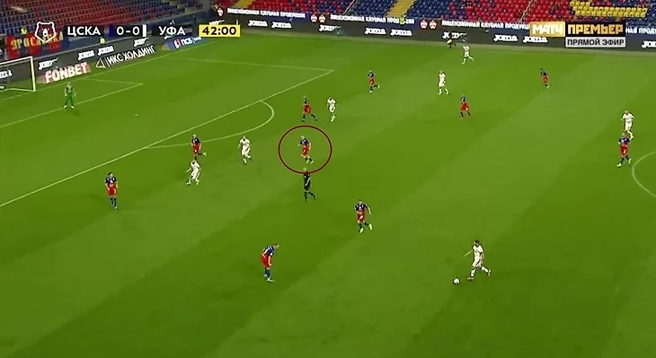 При этом гости подготовились и к стандартам. С угловыми не получилось так опасно (их было всего два), зато любой аут около штрафной мог закончиться ударом. Чаще всего они забрасывали мяч на ближнюю штангу, откуда уже старались или скинуть его на дальнюю (так пришёл голевой момент Кротова), или довести до зоны подбора (после рикошета от соперника опасно бил Камилов). ЦСКА целенаправленно готовился к обороне без мяча на своей половине. Хозяева откатывались и встречали «Уфу» в структуре 4-1-4-1, где Мухин страховал всю атакующую группу. Армейцы редко выдвигались в прессинг и большую часть времени проводили в среднем блоке. Подобное расположение помогало справляться с навесами соперника – оборонительный блок успевал садиться ниже, и кто-то из игроков центральной зоны вместе с защитникам подстраивался под мяч.