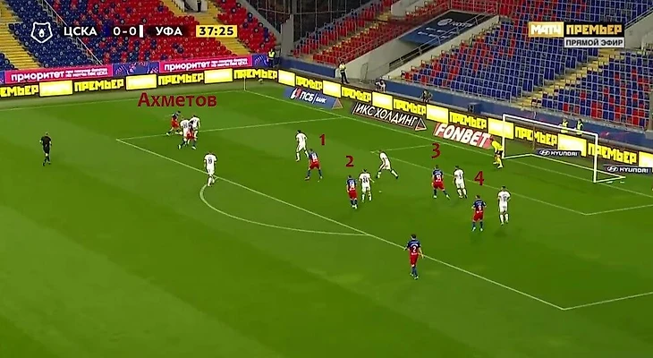 Стукалов подготовился к этому. Он выбрал расстановку 5-3-2 и наделил особой ролью без мяча уже своих восьмёрок. Мрзляк и Камилов должны были встречать крайнего защитника ЦСКА, если он принимал мяч на своей половине и двигался с ним дальше. Помимо подобной задачи они смещались на фланги и страховали вингбеков. У «Уфы» получалось в большинстве случаев сдерживать активность ЦСКА в этой зоне, но Березуцкий нашёл лазейку. Он выпустил Ахметова слева в нападении и надеялся на его дриблинг. Два раза хозяева доводили мяч до него на углу штрафной и насыщали её. Проходы Ильзата заканчивались опасно – сначала Бохинен без опеки пробил из центра штрафной, а затем был заблокирован удар самого Ахметова, и Фернандес после этого отскока имел голевой момент.
