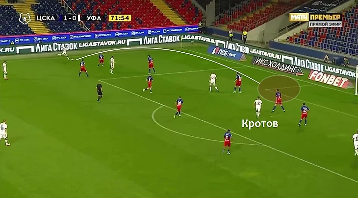 ЦСКА не стремился постоянно контролировать мяч. Периодически «Уфа» долго развивала позиционные атаки в средней трети (итоговый процент владения - 51 на 49 в пользу гостей). Главная задумка Стукалова на чужой половине - довести мяч до вингбека на фланге и подать в штрафную, где уже два или три игрока будут подстраиваться под этот пас. Так они создали момент для Кротова во втором тайме.