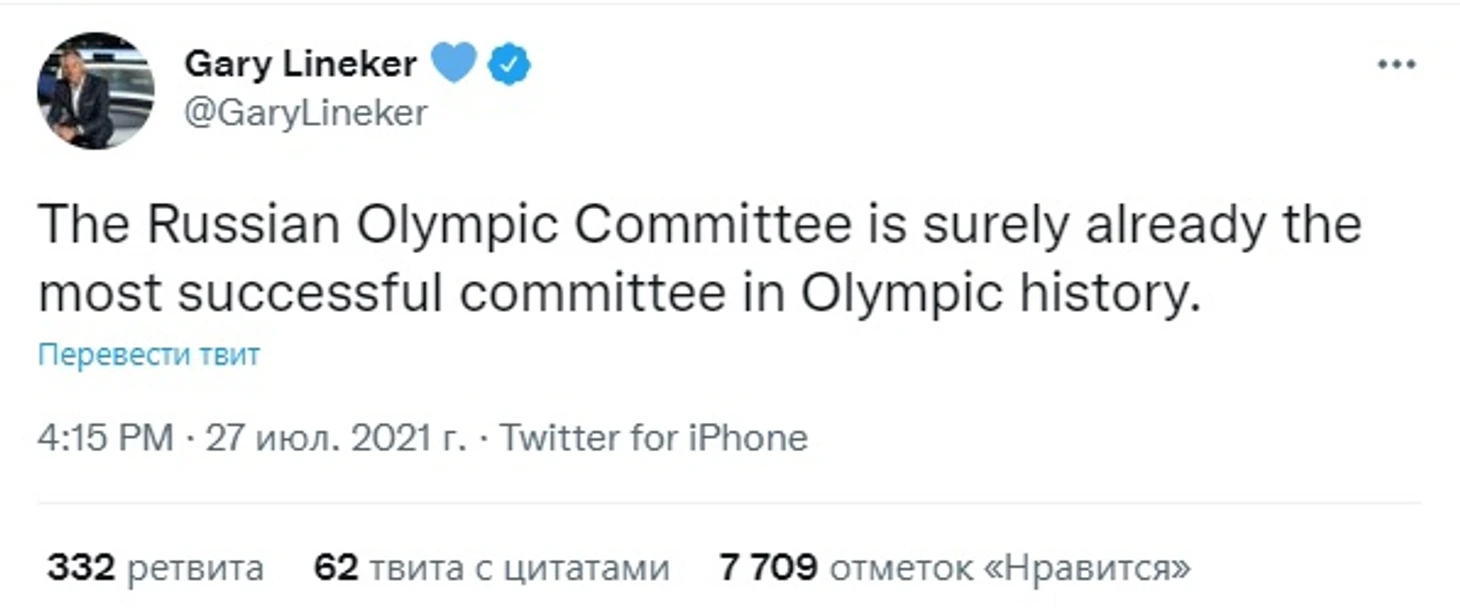 Хорошо, что не все разделяют негативное отношение к российским атлетам на Олимпиаде. Например, Гари Линекер в первые дни игр позитивно пошутил в твиттере:«Российский Олимпийский Комитет уже точно стал самым успешным комитетом в истории Олимпийских игр».