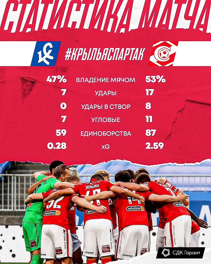 Не знаю, измененный ли, пусть и минимально, состав команды повлиял на общий настрой игроков, однако спартаковцы добрых полчаса выглядели довольно слабо. Они, как показалось, даже готовы были отдать инициативу в матче хозяевам, чтобы затем понадеяться на свои быстрые контратаки. Правда, контратак не было, потому что «Спартак» выглядел каким-то сонным и подчас не понимающим, как действовать в той или иной ситуации. Я уже упомянул Промеса и Ларссона, которые приехали в «Спартак» не в лучшем состоянии. Но ведь и того же Зобинина как будто бы подменили. А, что не сборники? Дается шанс с первых минут Бакаеву, Игнатову – нет никакой внятной игры. Хотя ведь смогли же во втором тайме разыграть очень неплохую комбинацию, и Бакаев даже забил. Правда, оказался вне игры. Умяров? Как-то не находил себя на поле, зазевался с мячом на 15-й минуте и хорошо еще «Крылья» не воспользовались возможностью забить. Может быть причины такой инертной игры надо поискать где-то в недрах тренировочной работы или в каких-то стратегических замыслах тренерского штаба, который прекрасно помнит про сложный игровой график ближайших дней. И все же… Только к 30-й (!) минуте спартаковцы вспомнили наконец, где находятся чужие ворота и провели серию неплохих атак. Айртон пробил опасно, Зобнин разыграл с Бакаевым комбинацию, но мяч прошел рядом со стойкой, наконец, Соболев попал во вратаря с близкой дистанции… Но эта вспышка оказалась кратковременной и на перерыв команды ушли при счете 0:0. Счете справедливом, потому что, пусть и в силу разных обстоятельств, но забить не могли ни те, ни другие. Хотя хозяева это все же сделать очень хотели.