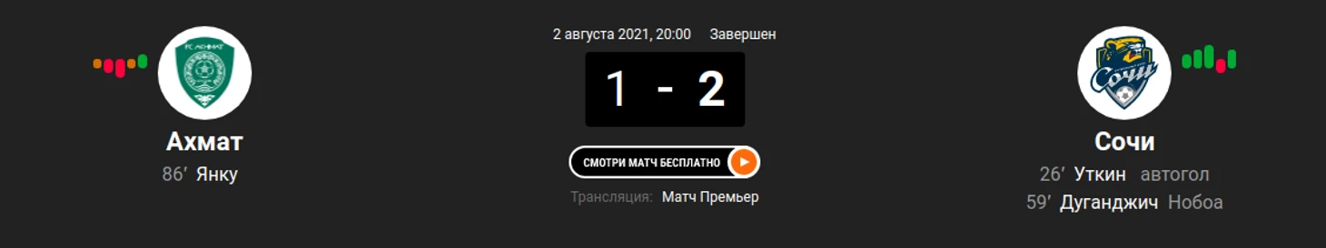 "Сочи" одержал гостевую победу над "Ахматом". Хозяева забили дважды, но гол Даниила Уткина был забит в свои ворота. Для "Сочи" это - первая победа в сезоне, а для "Ахмата" - первое поражение.