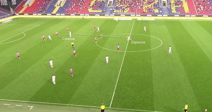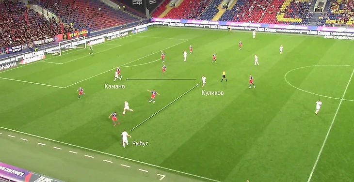 63,5% передач «Локомотива» в первом тайме были сделаны в средней трети – перекатов между Магкеевым, Мурило, Бариновым, Куликовым и Рыбусем было слишком много. Несмотря на огромный перевес «Локо» во владении и количестве касаний мяча (377 на 222), до перерыва Камано реже всех полевых игроков встречался с мячом, а Смолов из футболистов ЦСКА по этому показателю опередил лишь Мухина и Чалова. Рыбчинский большую часть первого тайма тоже был выключен из позиционных атак «Локомотива».