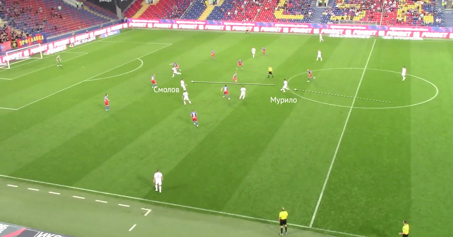 Единственный удар с игры в матче Смолов нанес именно после отхода в опорную зону ЦСКА. Это атака на 16-й минуте была связана с еще одним приемом, которым «Локомотив» периодически (кажется, можно было чаще) пользовался по ходу первого тайма – выдвижение Мурило с мячом за центральный круг.