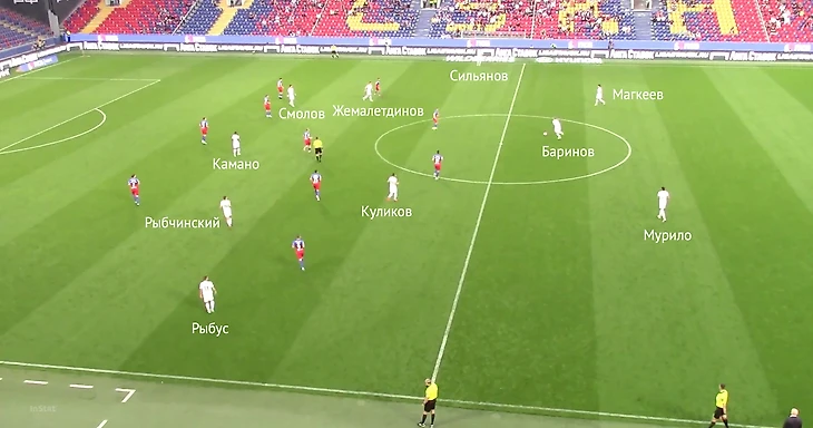 Опасный удар Фернандеса был связан с недоработкой Камано. Почти сразу после этого эпизода Николич заменил Франсуа на Пабло, передвинул Миранчука налево, Магкеева – в опорную зону, а Куликова – на место десятки.