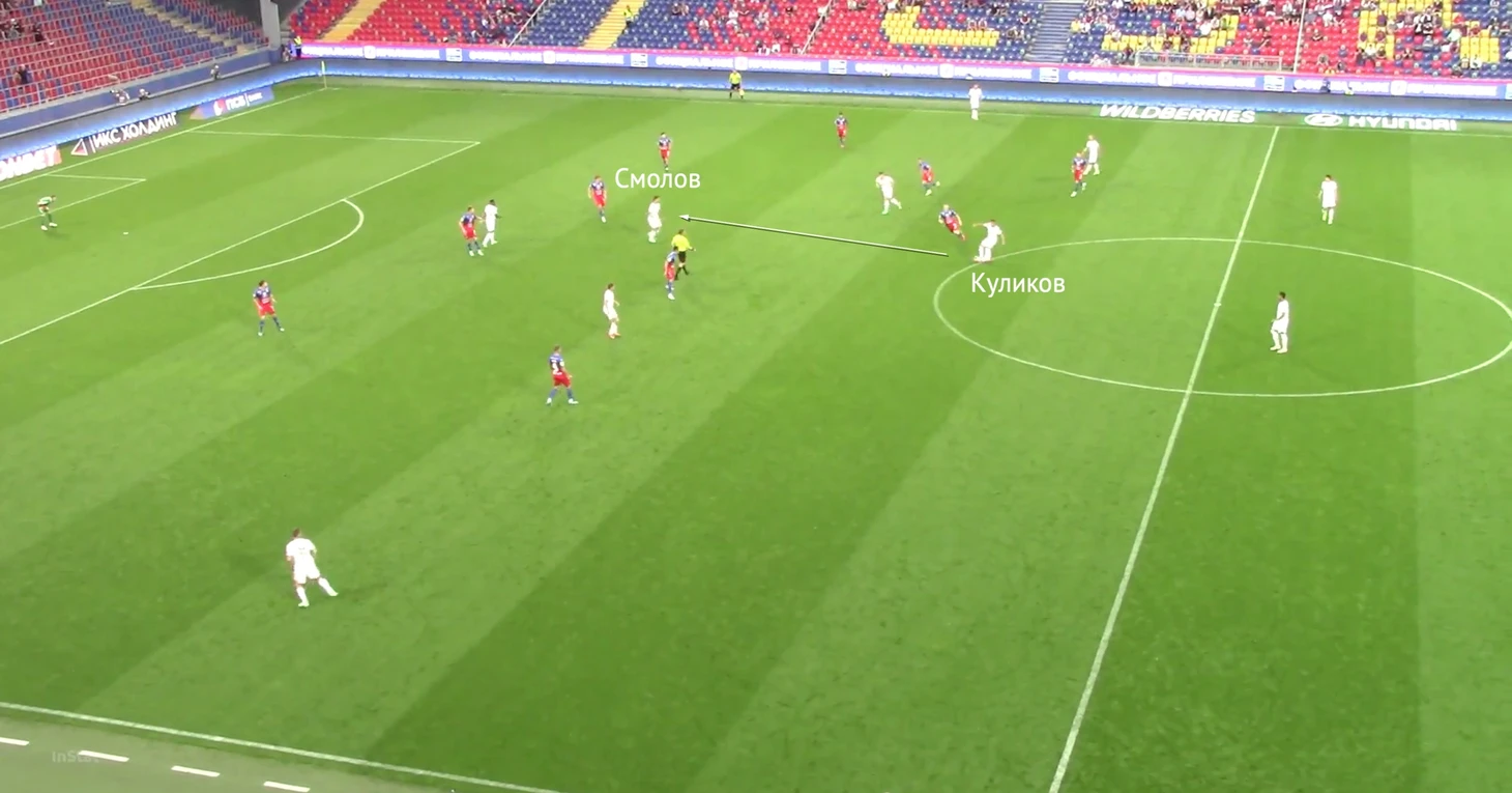 6. При этом нельзя сказать, что у «Локомотива» вообще не было интересных розыгрышей в позиционных атаках. Во-первых, доставка мяча к финальной трети шла лучше, когда Куликов поднимался выше Баринова, находил свободное пространство и пасовал в одно-два касания дальше.