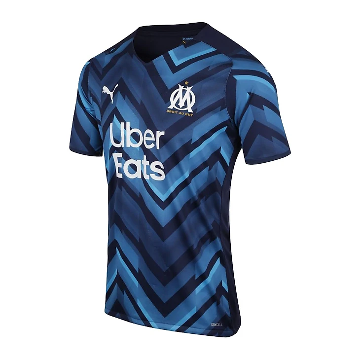 Новая гостевая форма «Марселя» выполнена в синих тонах. V-образный узор покрывает лицевую сторону футболки. Эмблема клуба и спонсоров выкрашены в белый.
