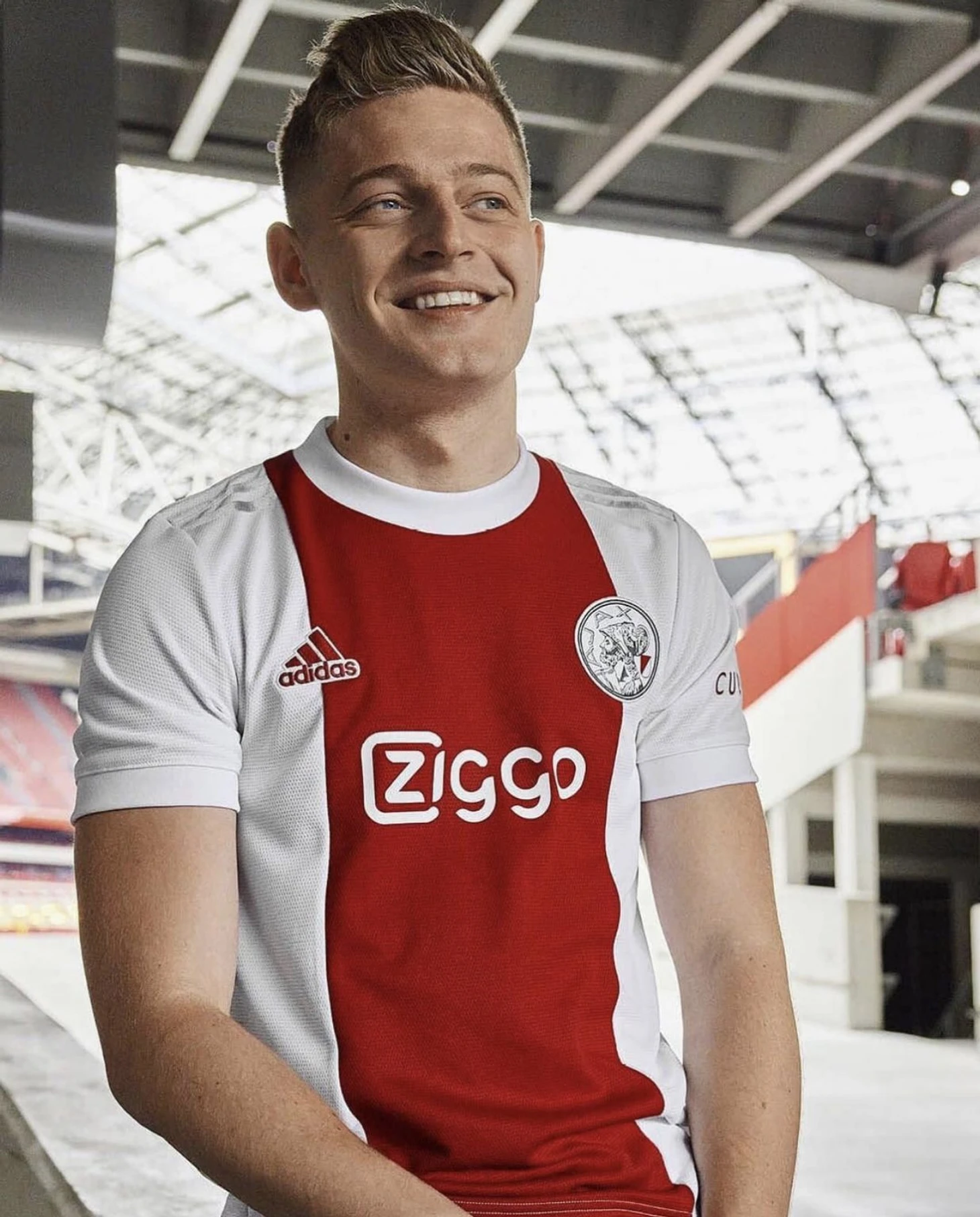 Новая домашняя форма «Аякса» 2021-2022 выполнена в классической расцветке — Белая форма с широкой красной полосой по центру. Полосы на плечах серые. Воротник круглый и белый. На футболке используется ретро-эмблема клуба.