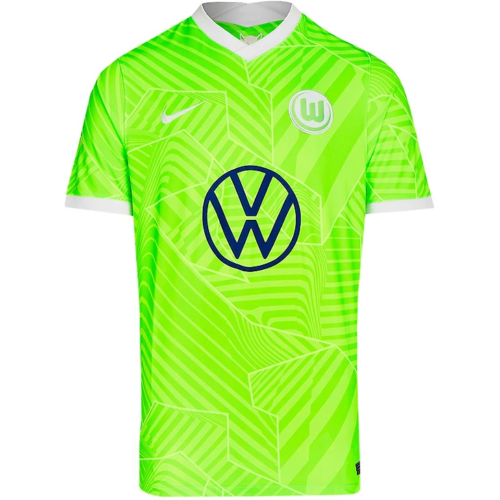 Новая форма «Вольфсбурга» 21/22 имеет салатовый цвет, белый воротник и манжеты. Футболка покрыта геометрическим узоров в полоску. Эмблема титульного спонсора — синяя.