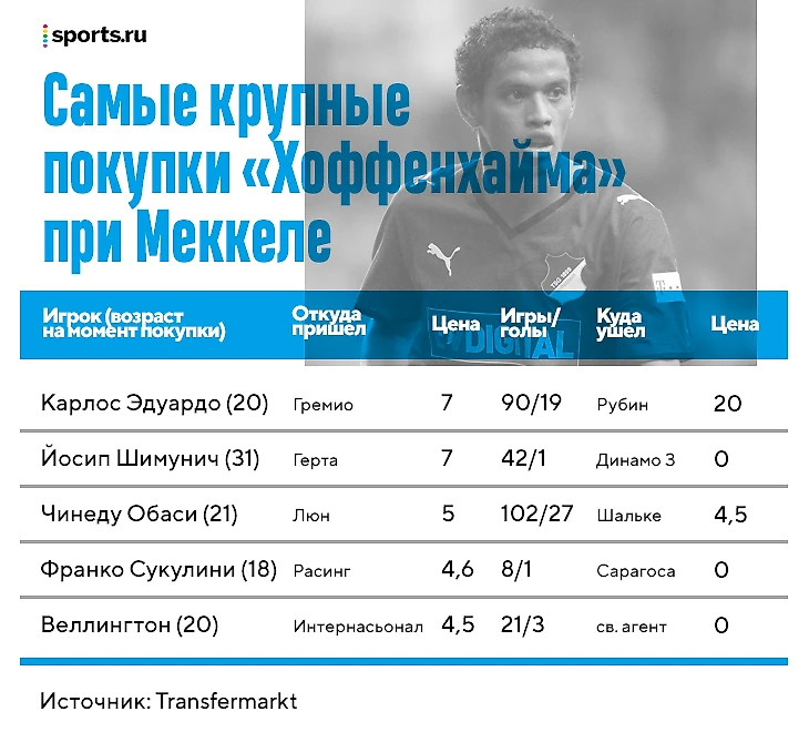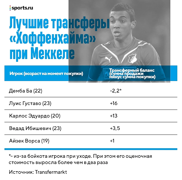 В Бельгии Меккель присмотрел 22-летнего Демба Ба: «Я действительно лично его нашел. Хотя вообще приехал просматривать другого игрока». В итоге сенегалец, который обошелся «Хоффенхайму» в 3 млн евро, провел за клуб 106 матчей и забил 40 голов. Эти трансферы помогли клубу всего за два года проскочить два дивизиона, оказаться в первой Бундеслиге и сходу уверенно в ней закрепиться.