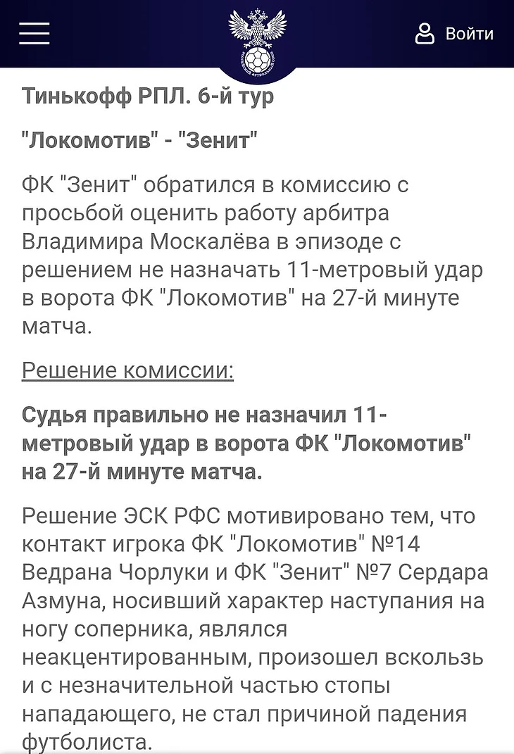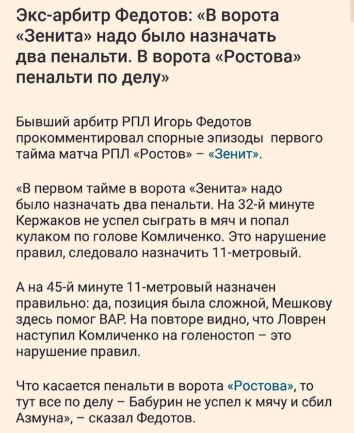 В качестве десерта позвольте со своей стороны задать ответный вопрос всем московским "специалистам" по футбольным правилам: объясните, почему за фол Деяна Ловрена, который наступил на голеностоп нападающему ростовчан в ворота петербуржцев назначили пенальти. А в случае с Сердаром Азмуном, по отношению к которому другой хорват, а именно Ведран Чорлука совершил аналогичное нарушение правил 11-метровый назначен не был?