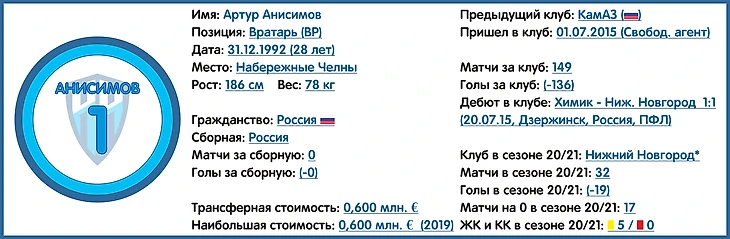 Весь прошлый сезон основным голкипером команды был Артур Анисимов, выступающий за клуб с момента его основания.