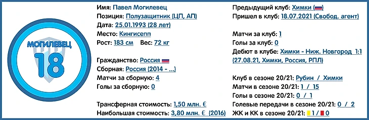 Ну и не будем забывать о поигравшем в сборной России Павле Могилевце (4 игры), который пропустил начало сезона, но сейчас набрал форму и уже выходил в последнем матче за свой новый клуб в стартовом составе (до этого Павел играл в «Рубине» и «Химках»).