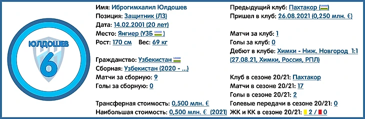 Узбекский футболист Иброхимхалил Юлдошев прешел в «Нижний Новгород» из ташкентского Пахтакора 26 августа 2021 года, однако уже на следующий день сыграл в стартовом составе за свой новый клуб в поединке против подмосковных «Химок» (1:1).