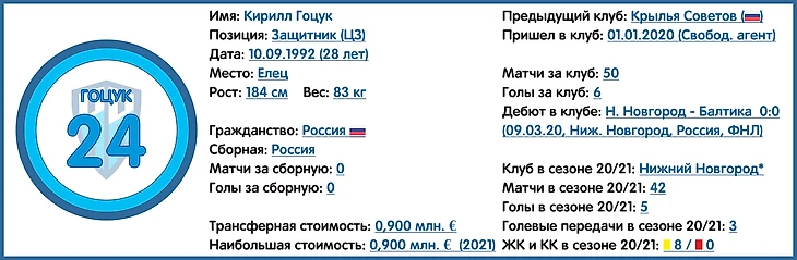 Кирилл Гоцук выступает в составе «Нижнего Новгорода» уже третий сезон, и за это время сумел не только проявить себя в защитных порядках, но и отметился достаточно неплохим счетом забитых мячей (6 голов в 50 встречах).