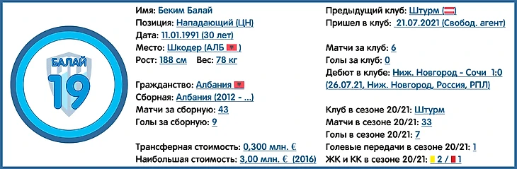 В нападении практически безоговорочно место в стартовом составе у албанского форварда Бекима Балая, который ранее уже выступал в РПЛ в составе грозненского «Ахмата».