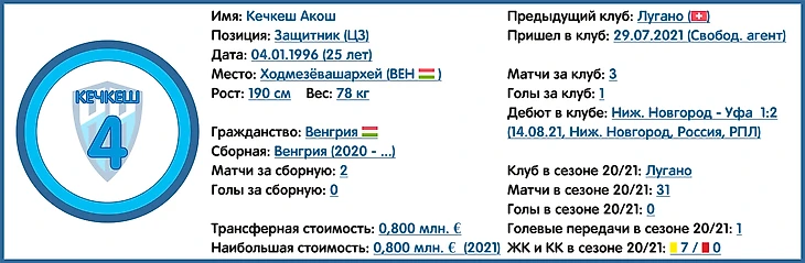 Так же совсем недавно был куплен и ещё один центральный защитник, венгр Акош Кечкеш, до этого выступавший за швейцарский Лугано», и который пока что заменяет травмированного Миладиновича.