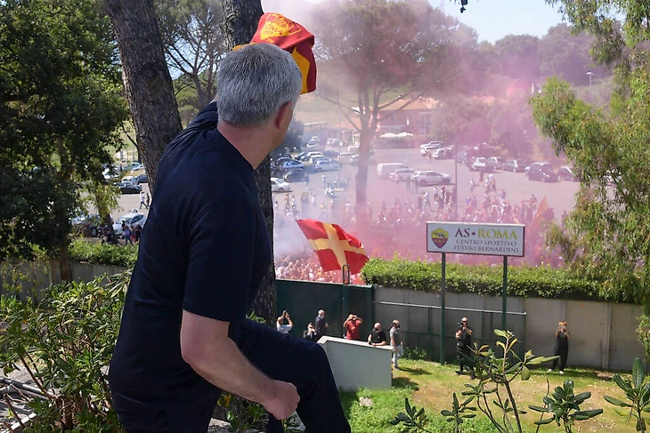 Около тысячи болельщиков находились за ограждением, когда Моуринью опустил окно своей машины, накинул на улицу шарф "Ромы" и застенчиво приветствовал их тихим голосом: “Чао”. Еще больше людей ждали его за пределами тренировочной площадки, где он появился на балконе и, еще раз подражая Августу, указал на волчицу на клубном шарфе.
