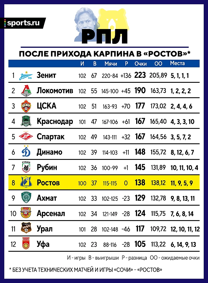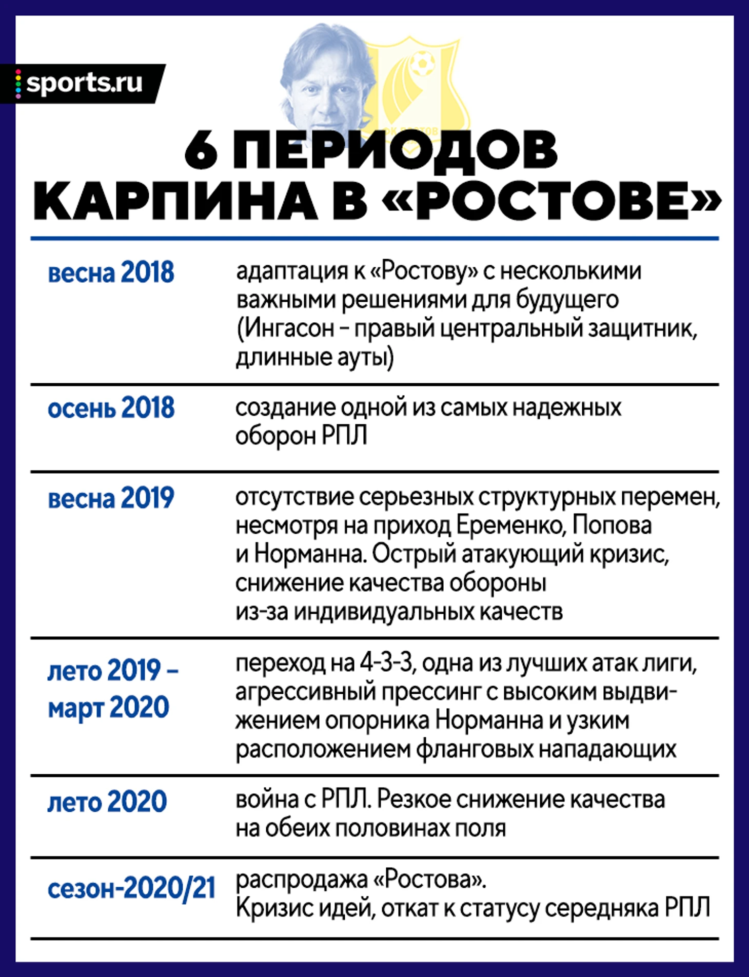 Три с половиной года Карпина в «Ростове» – действительно эпоха, дольше с командой работали только четыре тренера (и то Сергей Балахнин – за пять заходов). Карпин получил уникальный опыт – после кошмарных условий в «Мальорке» и Армавире – и, кажется, переосмыслил профессию, получил возможность для творчества, при этом все равно подстраиваясь под обстоятельства.