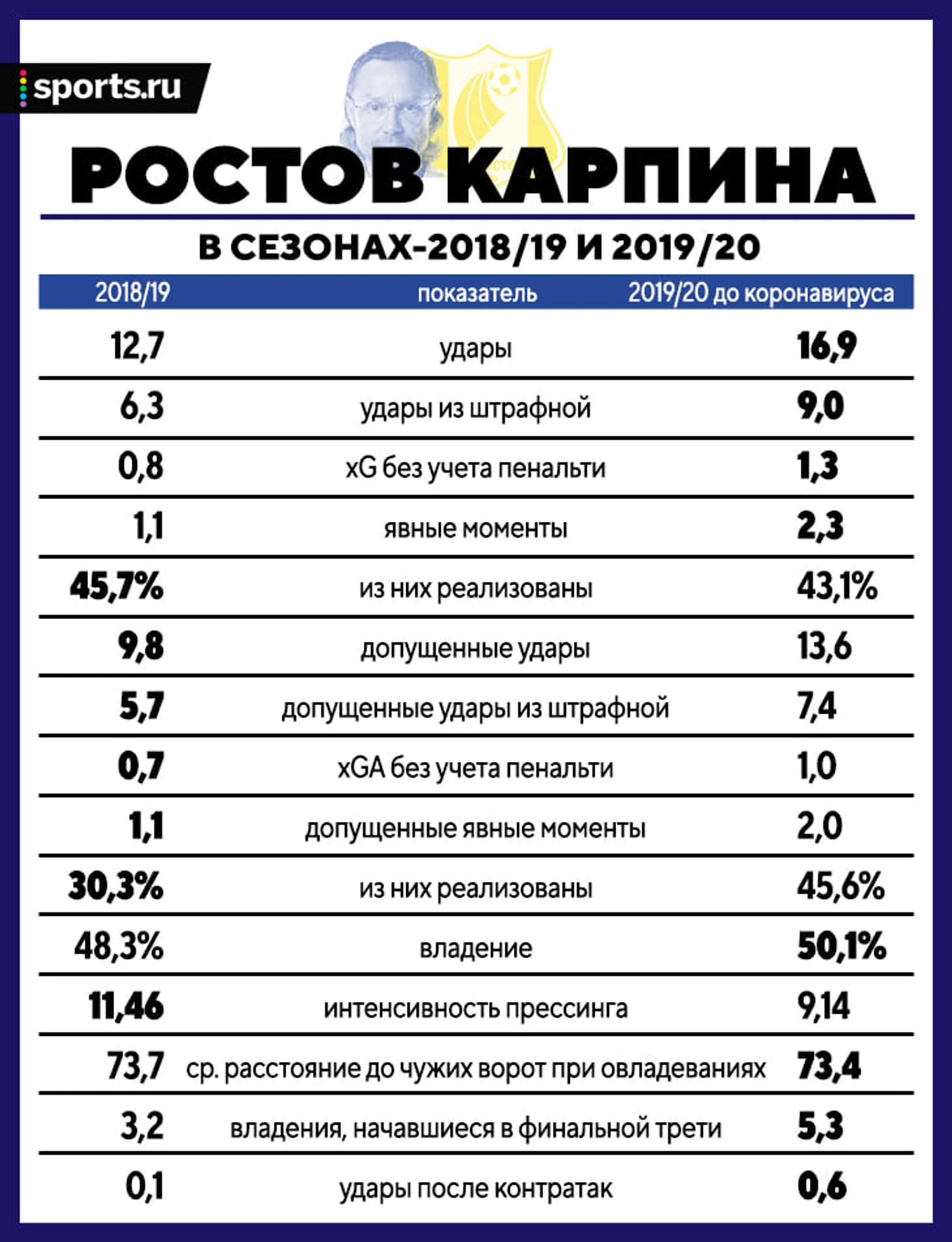К зимнему перерыву сезона-2017/18 «Ростов» Леонида Кучука подошел как одна из самых организованных, но скучных команд лиги: 14-е место по голам, 3-е – по пропущенным, 6-е – по качеству допущенных моментов. Карпин сохранил схему с тремя центральными защитниками, но не все детали – например, менял позицию Ингасона для лучшего продвижения мяча.