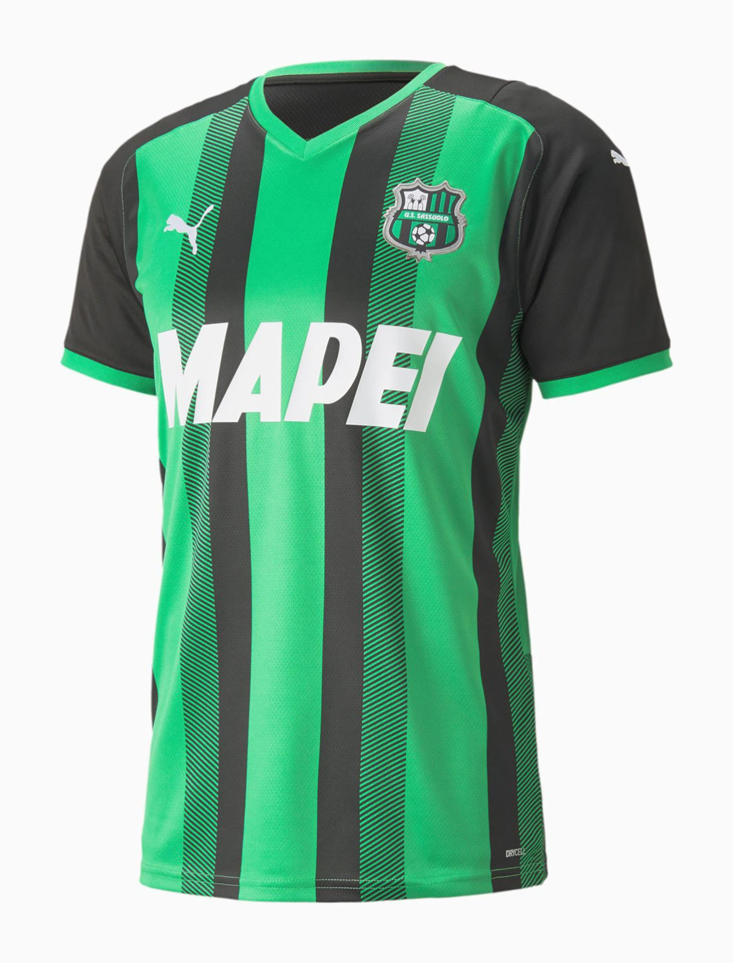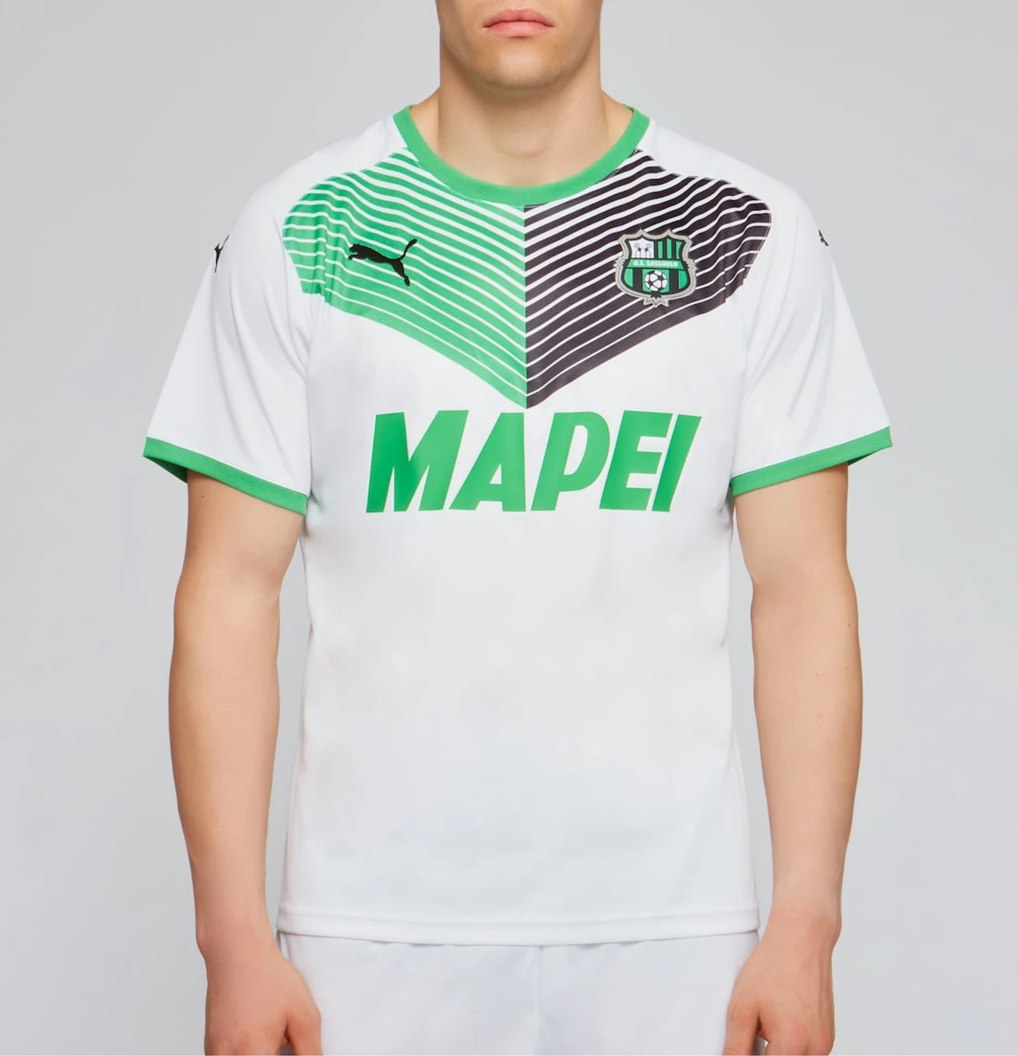 Домашний комплект «Сассуоло» от Puma – сочетание вертикальных зеленых и черных полос.