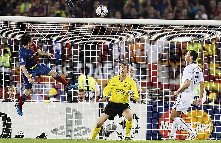 8. Месси в финале ЛЧ-2008/09 с «МЮ» делает счет 2:0 – завис в воздухе и попал головой прямо как Роналду!