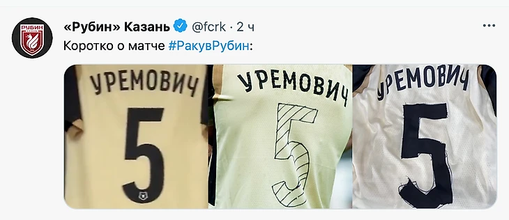 Проблемы были не только у Хвичи. Например, у Джордже Деспотовича отклеился и номер. В итоге с поврежденными или целиком отклеившиемися номерами и фамилиями тайм закончили сразу несколько футболистов «Рубина». Исправить ситуацию попытались креативно – номера сами нарисовали фломастерами.