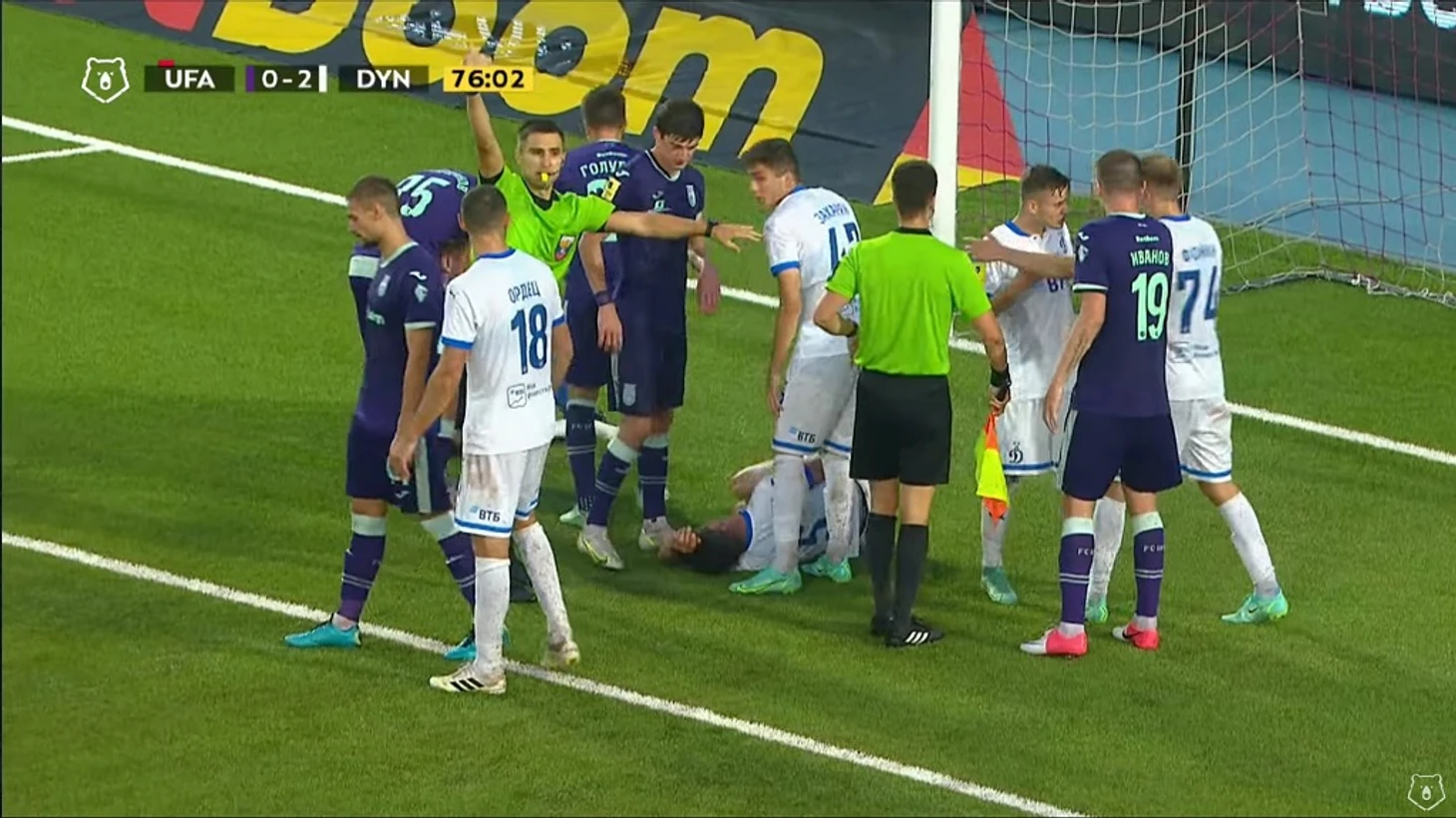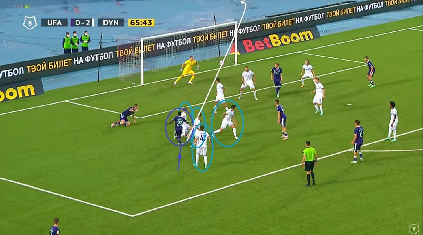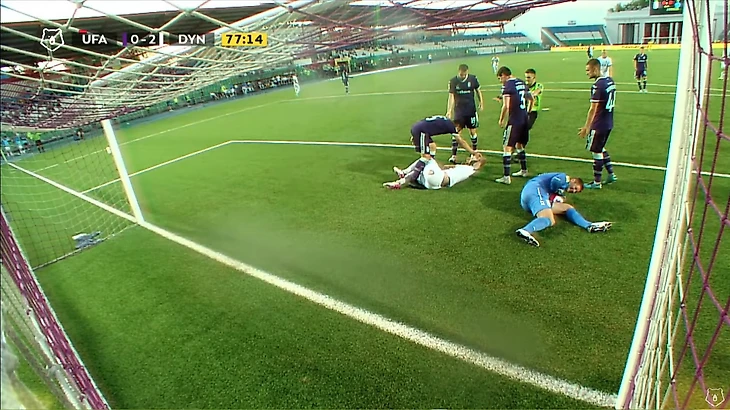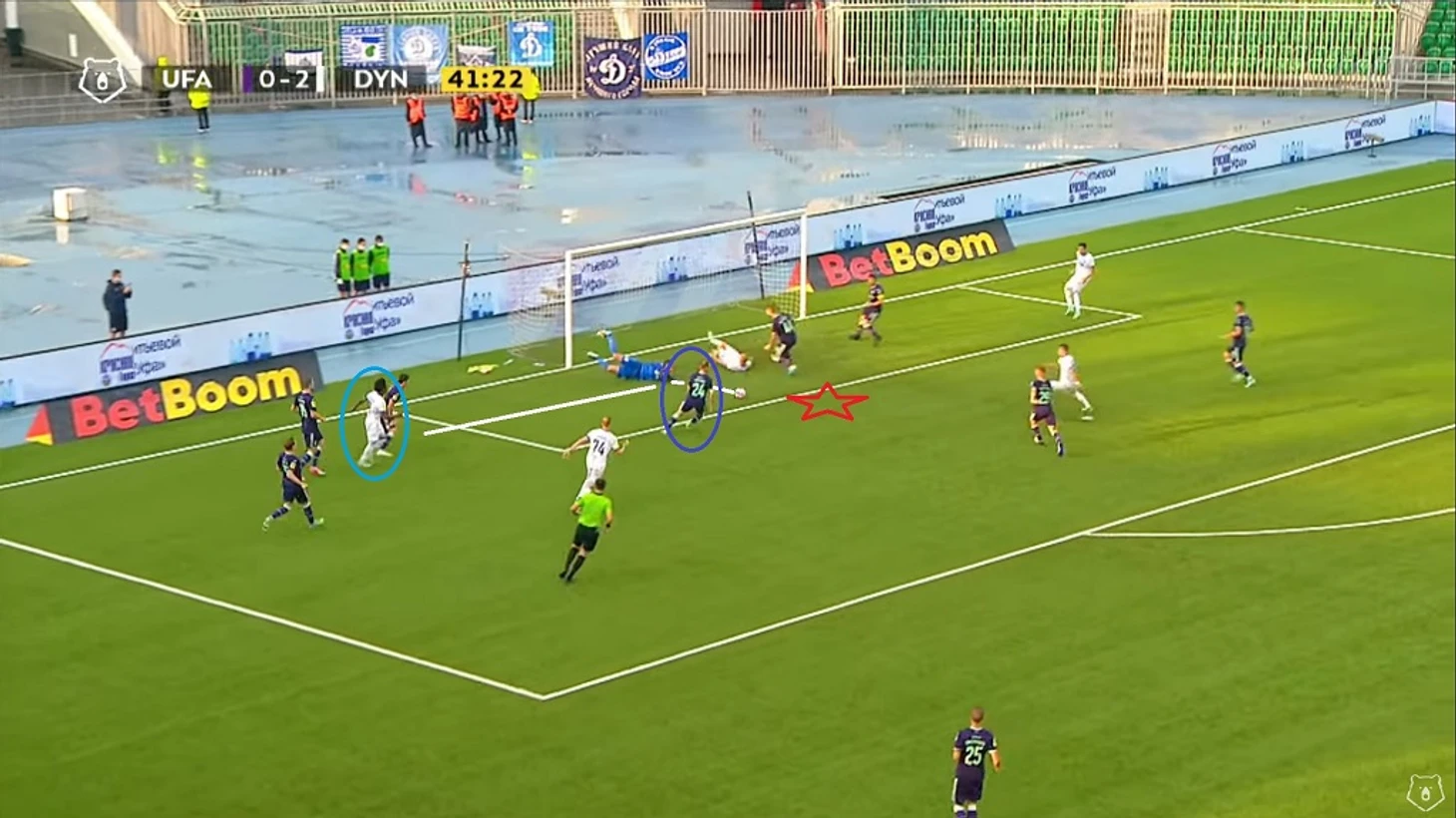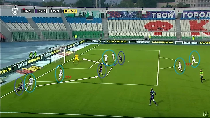 Возвращаемся к футболу, ведь самое интересное было ещё впереди. Хотя для игры нашей команды больше подходит слово «катастрофическое». Чуть более двух лет назад Динамо проиграло дома 0:1 Рубину, игравшему почти час в меньшинстве. Но в этот раз команда превзошла себя, пропустив в большинстве два гола за 5 минут… Беленов начинает первую голевую атаку длинным пасом от ворот, а первым на подборе мяча в центре оказывается Олег Иванов. Следует перевод на капитана, который, убрав на замахе Захаряна, навешивает в центр штрафной точно на Жамалетдинова. Не знаю, перевёл ли Шунин мяч в штангу, но вот успеть встать после прыжка он уже не успел — Агаларов расстреливает ворота, отыгрывая один мяч. Ещё в разборе первого тура я отмечал, что мы частенько проигрываем верховую борьбу после навесов в нашу штрафную. И вот снова нам прилетело... В этот раз я не буду разбирать ошибки каждого нашего игрока, а ещё раз отмечу какую чёткую атаку в 9 касаний провела Уфа: вынос от ворот, подбор, перевод на фаланг, обыгрыш с подачей, выигранное единоборство, первый на мяче после отскока.