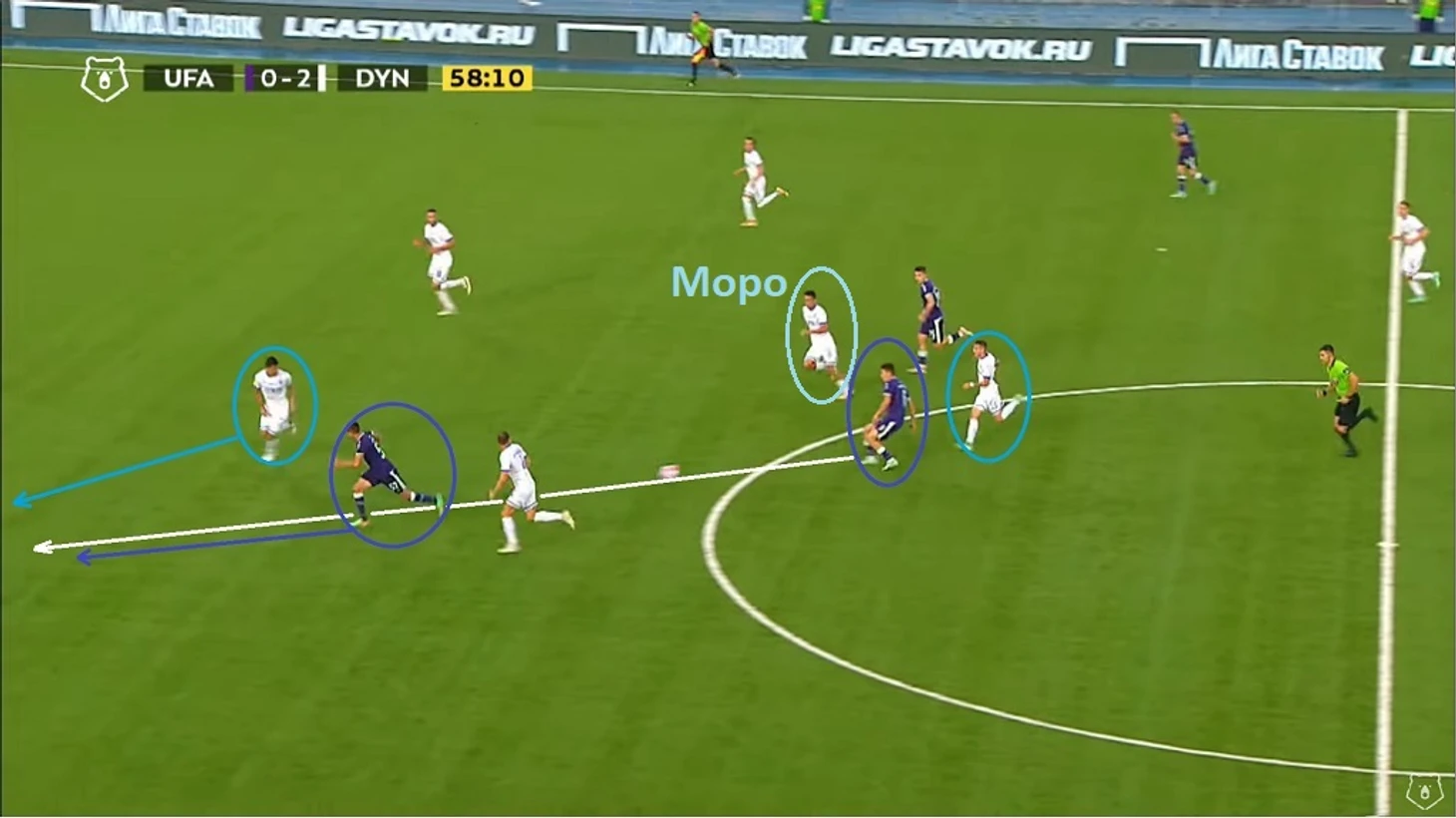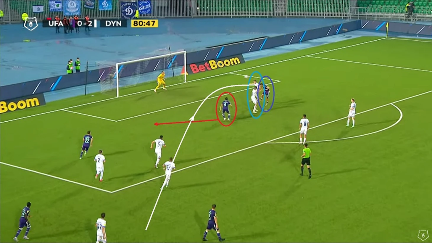 Минутой позже, вышедший на замену Фищенко вначале играет на опережение и отбирает мяч у Шиманьски, затем выводит на ударную позицию Кротова, и первым оказывается на подборе, завершая атаку ударом, переведённым Ордецом на угловой. Достаточно эффективный отрезок у новичка Уфы. Обратите внимание на Моро: должен ли он бежать к Фищенко или его параллельный бег это нормально?