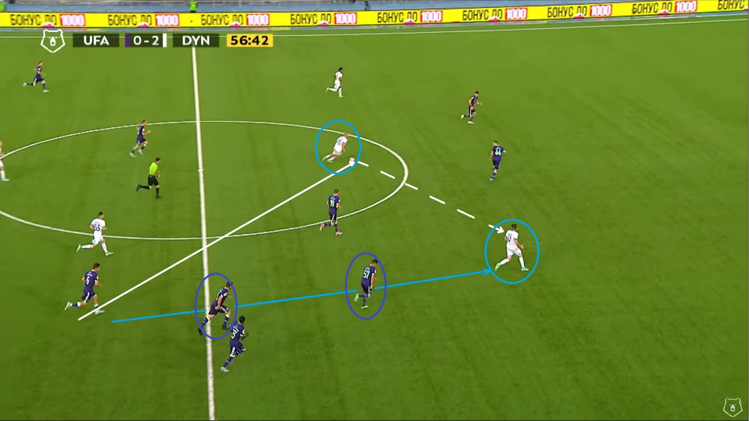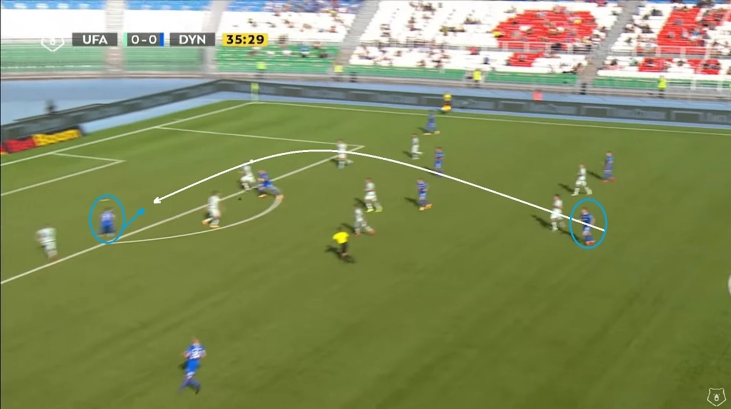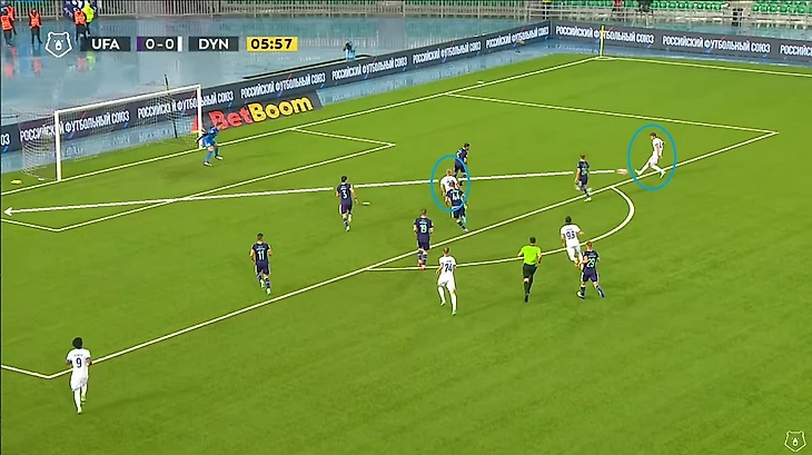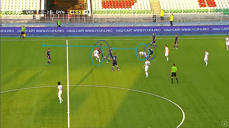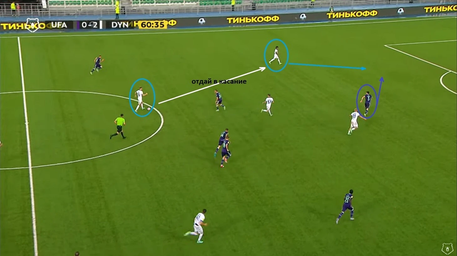 Второй тайм. В перерыве главный тренер Уфы Алексей Стукалов (сын Бориса Стукалова, помогавшего Виктору Прокопенко и в Роторе, и в Динамо) делает одну из ключевых замен: вместо Милетича выходит Эгаш Касинтура, который придал остроты атакам Уфы. Первые десять минут проходят в равной борьбе с потерями и перехватами у обоих сторон. Далее Стукалов проводит двойную замену, выпуская Руслана Фищенко и Тимура Жамалетдинова. И если о Тимуре мы могли бы слышать по играм за ЦСКА (2018, 14 игр, 398 минут включая 26 минут в ЛЧ, 3 гола, 1 передача), то Руслан только неделей ранее дебютировал в РПЛ, до этого проведя сезон на позиции опорника в московском Велесе в ФНЛ (39 игр из них 22 полных матчей, 1 передача, 11 предупреждений). Уфа освежает нападение и центр поля, не теряя надежды отыграться. Динамо грамотно прессингует и контратакует. В одной из таких контратак Тюкавин затянул с передачей на Захаряна (ему пришлось чуть затормозить, чтобы не попасть в офсайд) и защитники успели помешать Арсену нанести сильный удар. Обратите внимание, как Арсен легко убежал от соперников после передачи на Костю.