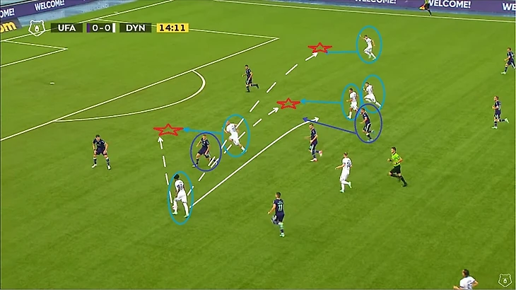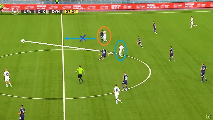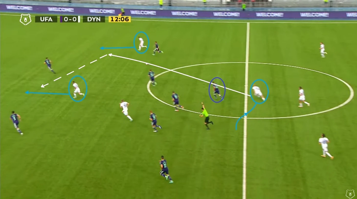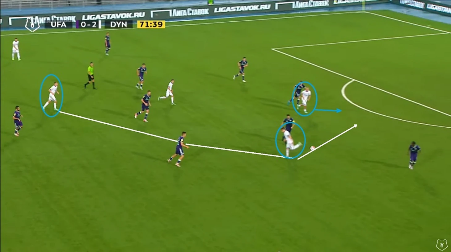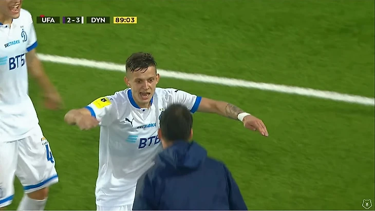 Второй тайм. В перерыве главный тренер Уфы Алексей Стукалов (сын Бориса Стукалова, помогавшего Виктору Прокопенко и в Роторе, и в Динамо) делает одну из ключевых замен: вместо Милетича выходит Эгаш Касинтура, который придал остроты атакам Уфы. Первые десять минут проходят в равной борьбе с потерями и перехватами у обоих сторон. Далее Стукалов проводит двойную замену, выпуская Руслана Фищенко и Тимура Жамалетдинова. И если о Тимуре мы могли бы слышать по играм за ЦСКА (2018, 14 игр, 398 минут включая 26 минут в ЛЧ, 3 гола, 1 передача), то Руслан только неделей ранее дебютировал в РПЛ, до этого проведя сезон на позиции опорника в московском Велесе в ФНЛ (39 игр из них 22 полных матчей, 1 передача, 11 предупреждений). Уфа освежает нападение и центр поля, не теряя надежды отыграться. Динамо грамотно прессингует и контратакует. В одной из таких контратак Тюкавин затянул с передачей на Захаряна (ему пришлось чуть затормозить, чтобы не попасть в офсайд) и защитники успели помешать Арсену нанести сильный удар. Обратите внимание, как Арсен легко убежал от соперников после передачи на Костю.