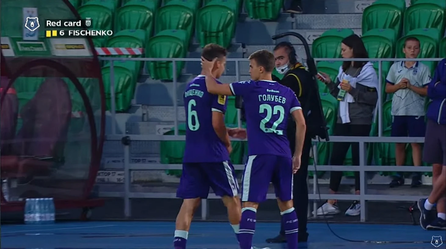 И тут же сразу Фищенко выполняет Удалялити (Udalyality, отсылка к Mortal Kombat, так как фамилия Руслана Фищенко созвучна с Finish Him!), получив два предупреждения за две минуты. Вначале он повалил на землю Шиманьски — устный выговор, но «жёлтая карточка в уме». Затем получил первое предупреждение за подножку Тюкавину и уже через 40 секунд зачем-то сыграл рукой… Глупейшее удаление молодого игрока. Но показать на фото я хочу не игру рукой, а совершенно другой, более важный эпизод: