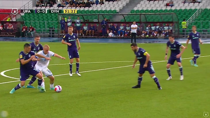 Первый тайм. Если игра в Ростове проходила в очень жаркую погоду, то игра в Уфе начиналась под аккомпанемент дождя, но уже при зрителях — на стадион было допущено 1000 болельщиков, причём на гостевой трибуне отсутствовала какая либо крыша или иная защита от дождя. И, если честно, я ожидал, что при такой погоде нам будет ещё сложнее показать свою игру, однако, к счастью, мои ожидания не оправдались. Первые пять минут мячом больше владела Уфа, при этом обе команды хорошо его контролировали. Первый динамовский момент случился на исходе шестой минуты: после классического и успешного прессинга на чужой территории Лаксальт смещается в центр и отдаёт на Захаряна, который, видимо в последний момент поменял решение и неэффективно выполнил что-то среднее между передачей на Тюкавина и ударом в касание.