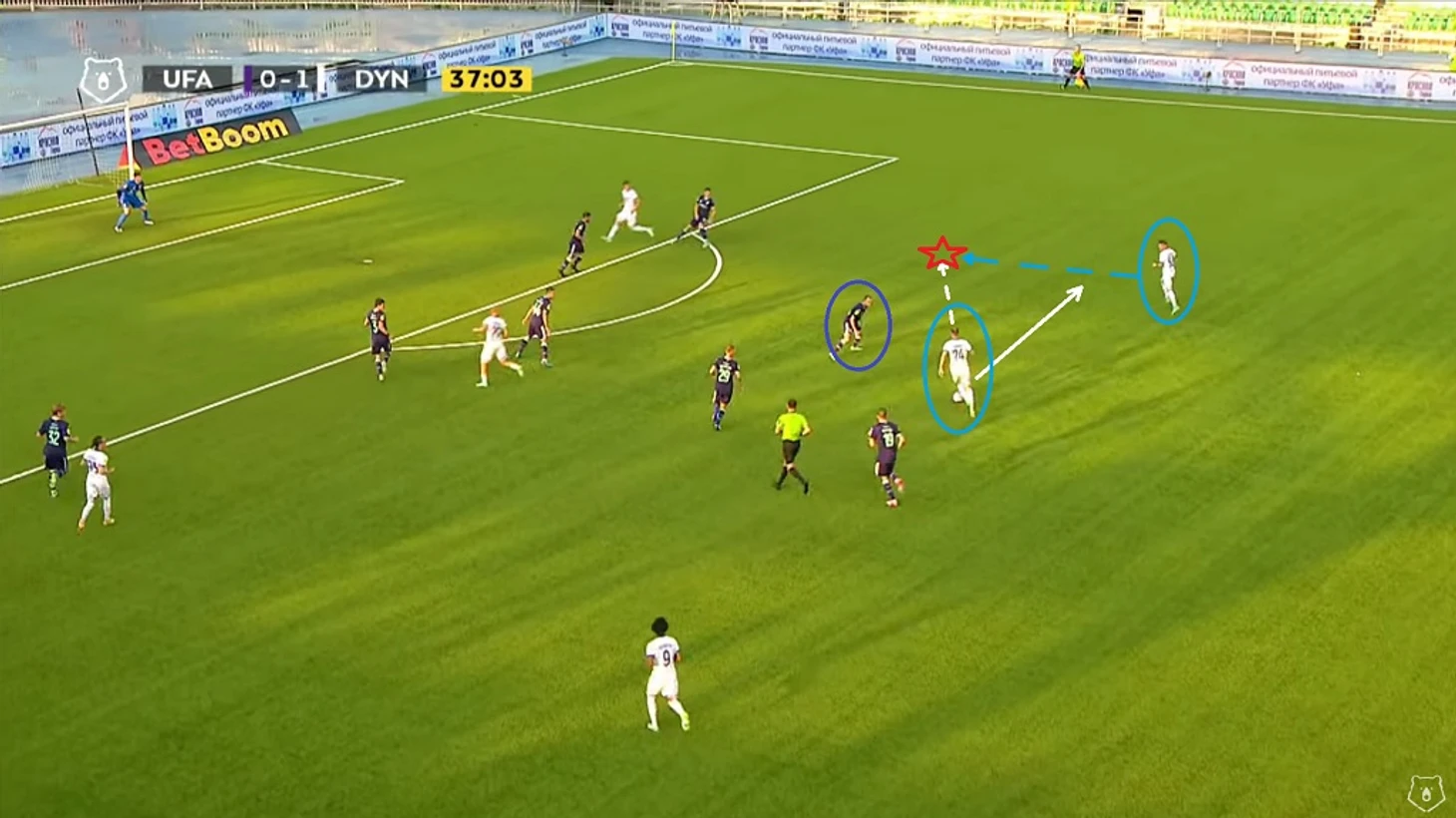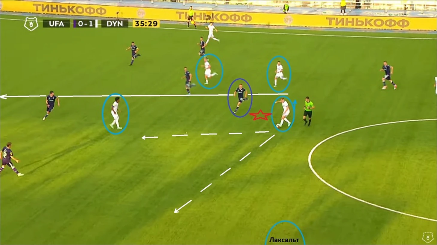 Немного позже Даниил принимает в корне ошибочное решение — вместо паса на свободного Нжи или набегающего Лаксальта, он разворачивается в сторону соперника и пасует точно на Беленова.